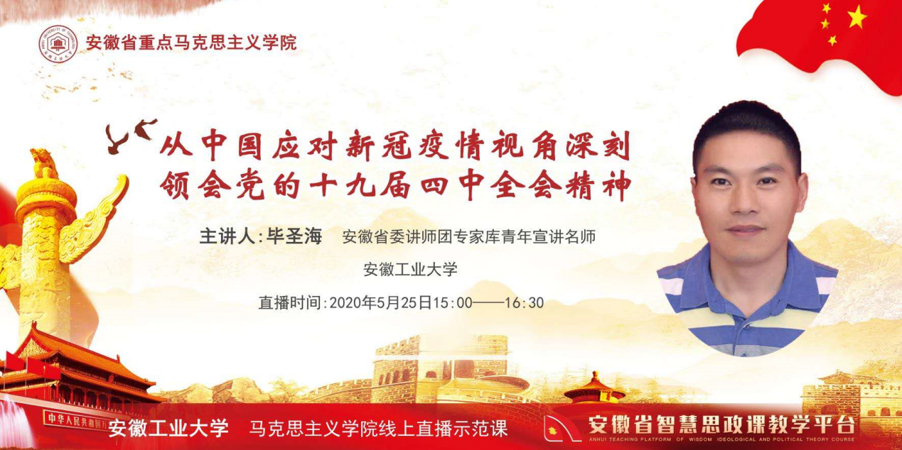 优秀党员教师、省委讲师团青年宣讲名师毕圣海,在安徽省智慧思政课教学平台开展了全省线上直播公开课。结合本学期将疫情防控融入《毛泽东思想和中国特色社会主义理论体系概论》教学要求,他选择的讲授专题是《从中国应对新冠疫情视角深刻领会党的十九届四中全会精神》。