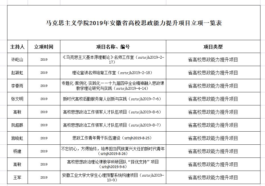 海星体育直播 2019年安徽省高校思政能力提升项目立项一览表