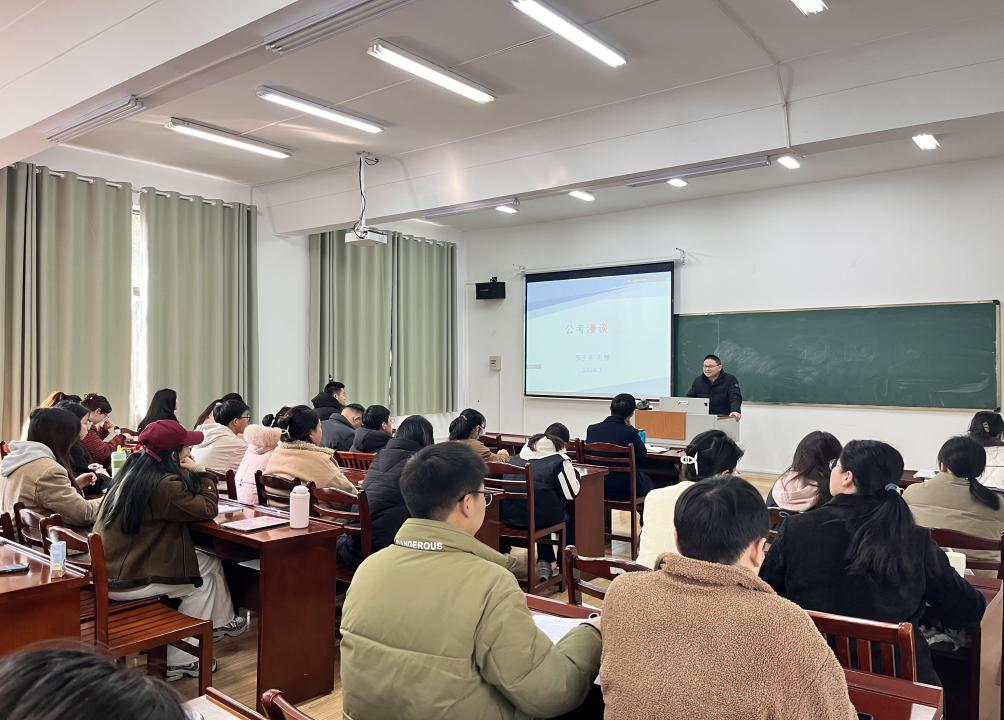 会上,韦子平老师首先从考公动机与公考特点入手,结合自身经历谈对公考的理解。他强调,了解这些公考的基础信息、明确参加公考的基本动机,对毕业班同学定位自己的目标和方向至关重要。随后韦子平老师结合多年来经验,从行政机关和公务员的基本概念入手,详细介绍了公务员的分类、职责以及选拔标准、管理体制等相关知识,并详细分享了如何写申论、如何高效阅读时政新闻等相关方法,强调如何透过现象看本质,学会站在不同岗位上分析国家时政大事至关重要。接着,韦子平老师重点站在考生视角,围绕考录程序、报考条件、《中华人民共和国公务员法》、考试时间安排等相关规定,对公务员考试中遇到的各种问题与方法、表达习惯乃至行为举止等方面都进行了精彩阐述。