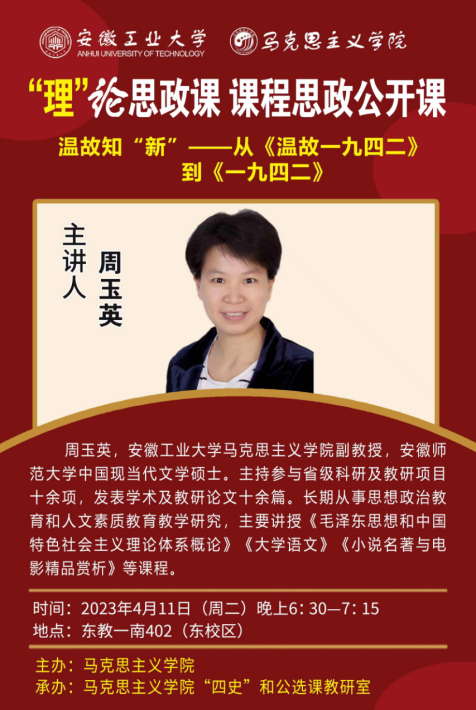主讲人物介绍:周玉英,海星体育直播平台 副教授,安徽师范大学中国现当代文学硕士。主持参与省级科研及教研项目十余项,发表学术及教研论文十余篇。长期从事思想政治教育和人文素质教育教学研究,主要讲授《毛泽东思想和中国特色社会主义理论体系概论》《大学语文》《小说名著与电影精品赏析》等课程。